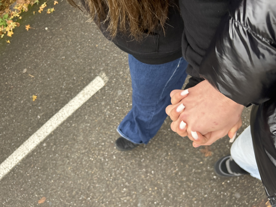 An overhead view captures two individuals walking on a grey asphalt surface featuring a faded white painted line. The scene is located in Strasbourg, France, and exhibits scattered yellow-brown autumn leaves and some green-yellow vegetation in the upper right corner. One individual, partially visible from the lower torso, wears light blue jeans and black shoes with white soles. This person's right hand, displaying minor skin blemishes, is clasped by the second individual. The second individual, visible from the upper torso, left arm, and lower body, wears dark blue jeans, black shoes, a black top, and a shiny black puffer jacket. A portion of light brown hair is visible on the right side of the frame. This individual's left hand, adorned with long, white, square-tipped manicured nails, firmly holds the first individual's hand. Both subjects are depicted in the act of ambulating while holding hands.