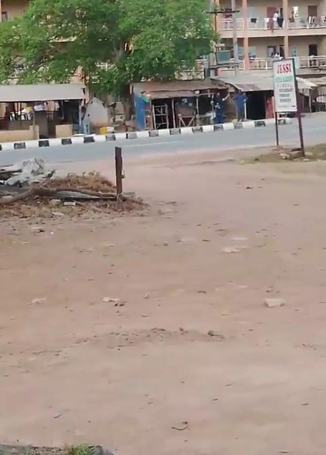 The video begins with a wide shot of a street in an urban area. A large tree is on the left side of the frame, with a person carrying a load on their head walking along a street in the background. There are buildings and small shops visible across the street. The camera then shifts its focus to a man standing next to a yellow motorcycle. He is wearing a grey cap, glasses, and a grey shirt. He is holding a phone in his hands and appears to be checking it. He looks up and smiles at the camera. Behind him is a red building.
