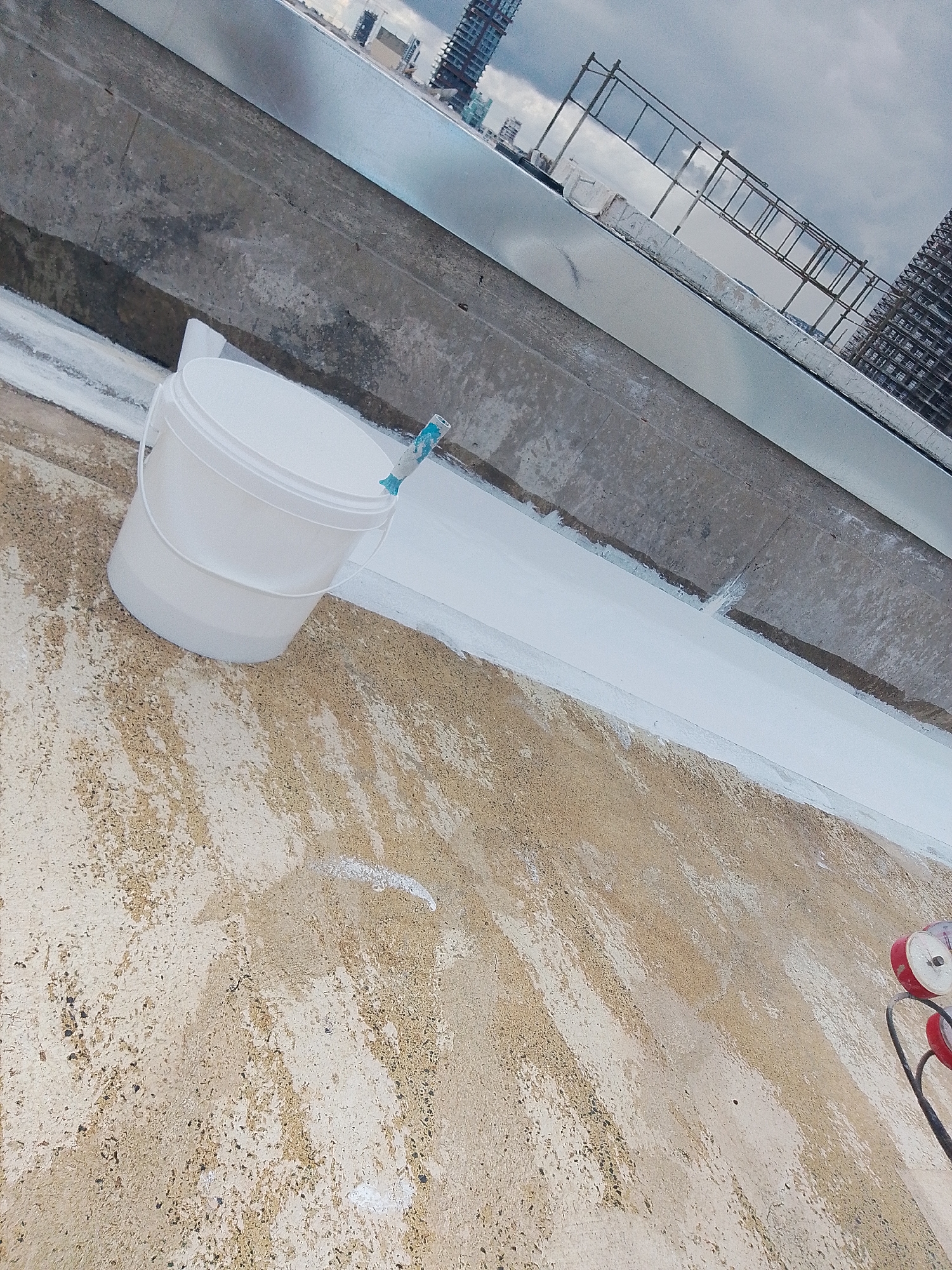 The scene depicts a concrete rooftop or elevated platform, situated in the city of Agios Tychonos, Cyprus, undergoing a waterproofing or painting application. A white plastic five-gallon bucket, containing a blue-handled brush, rests on the textured, light tan concrete surface in the lower left quadrant. A linear, approximately 15-centimeter wide band of freshly applied white waterproofing compound extends horizontally from left-center to right-center, along the base of a darker grey concrete wall. The concrete surface exhibits scattered white paint or compound splatter marks. The background reveals a distant urban skyline under a heavy grey sky, characterized by multiple high-rise structures, including buildings under construction with visible scaffolding and exposed concrete frameworks. A section of a metal barrier or scaffolding is present along the upper edge of the concrete wall. Two red-and-white spools on a black frame are partially visible in the bottom right corner. No human figures are present.