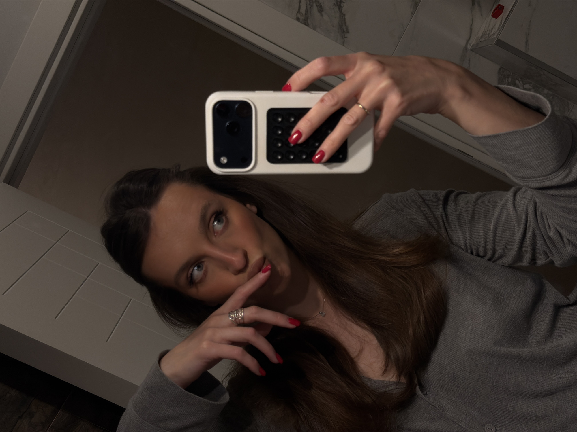 A woman is taking a selfie in what appears to be a bathroom. She is holding a white phone case with a dark rectangular shape and raised dots in her right hand. Her nails are painted red and she is wearing a gold ring on her right ring finger. She has a ring on her left hand, as well. She is wearing a gray long-sleeved shirt or sweater. Her brown hair is parted and falls around her shoulders. She has a pensive expression and is touching her lip with her left index finger. The background includes white vertical-striped paneling on one side, and a dark gray surface on the other. Above, there is a countertop covered in gray marble, likely part of a sink or vanity. There are no specific details that indicate the location is Budva, Montenegro.