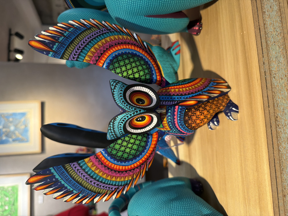 An ornate, brightly colored wooden sculpture of a creature with large wings and eyes dominates the scene. The wings are decorated with vibrant patterns of blues, greens, and rainbow stripes. The eyes are equally colorful, featuring concentric circles. The creature's body displays a complex orange pattern, and other teal-colored animal sculptures are seen in the background, adding to the scene's artistic and eclectic nature.