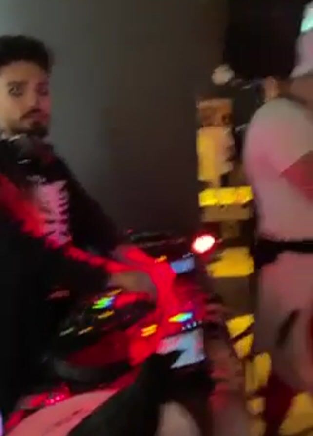 DJ in black with skeletal decoration mixing music, with a black bird perched on one of his turntables. He has headphones around his neck and is manipulating the mixer. The scene shifts to show a crowd of people in what appears to be a dimly lit club or bar with disco ball, some dancing or standing and talking. The camera moves through the crowd, showing various individuals briefly.