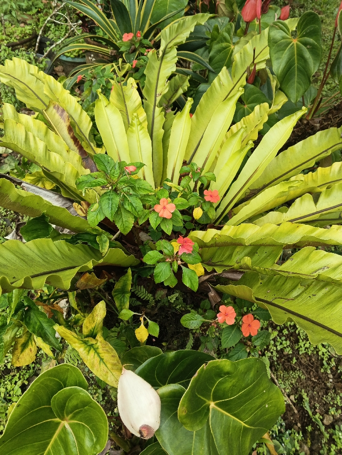 The image displays a close-up, high-angle view of a densely vegetated garden section in the city of Unknown, Vietnam. A large Bird's Nest Fern (Asplenium nidus) dominates the central and upper portions, exhibiting numerous broad, bright green, undulating fronds arranged in a rosette. Several smaller flowering plants with clusters of five-petaled, salmon-to-orange colored blossoms, consistent with Impatiens, are interspersed among the larger foliage, particularly in the mid-ground and lower-right. In the upper-right background, elongated red flower spathes and large, dark green, heart-shaped leaves, indicative of Anthurium species, are visible. The lower-left foreground features a prominent, detached white, elongated plant part, possibly a spathe, with a dark brown tip, resting on a broad, dark green leaf. The ground beneath the plants appears as dark soil mixed with various green leaf litter and smaller, indeterminate foliage. The overall environment is lush and verdant, characteristic of a tropical or subtropical setting. No individuals or man-made structures are present within the frame.