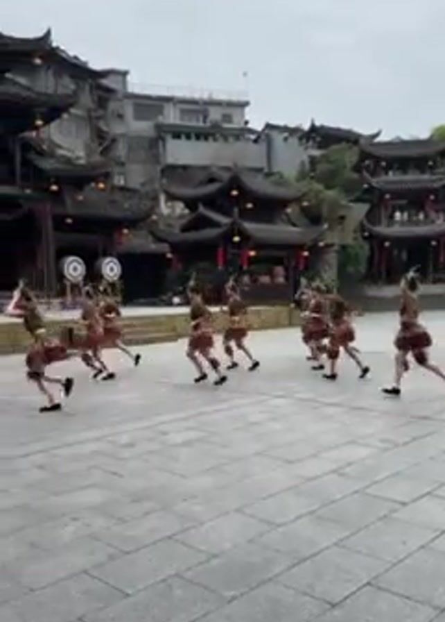 . In a medium shot, a group of children are performing a dance routine on a gray paved square. They are wearing matching brown and green costumes with what appear to be feathery headbands. They are moving in a circle and facing a stage with traditional Chinese architecture. There are decorative red and yellow lanterns hanging from the building’s roof. Behind the stage is a building that is several stories tall, and is also built in a traditional Chinese architectural style. The sky is gray.