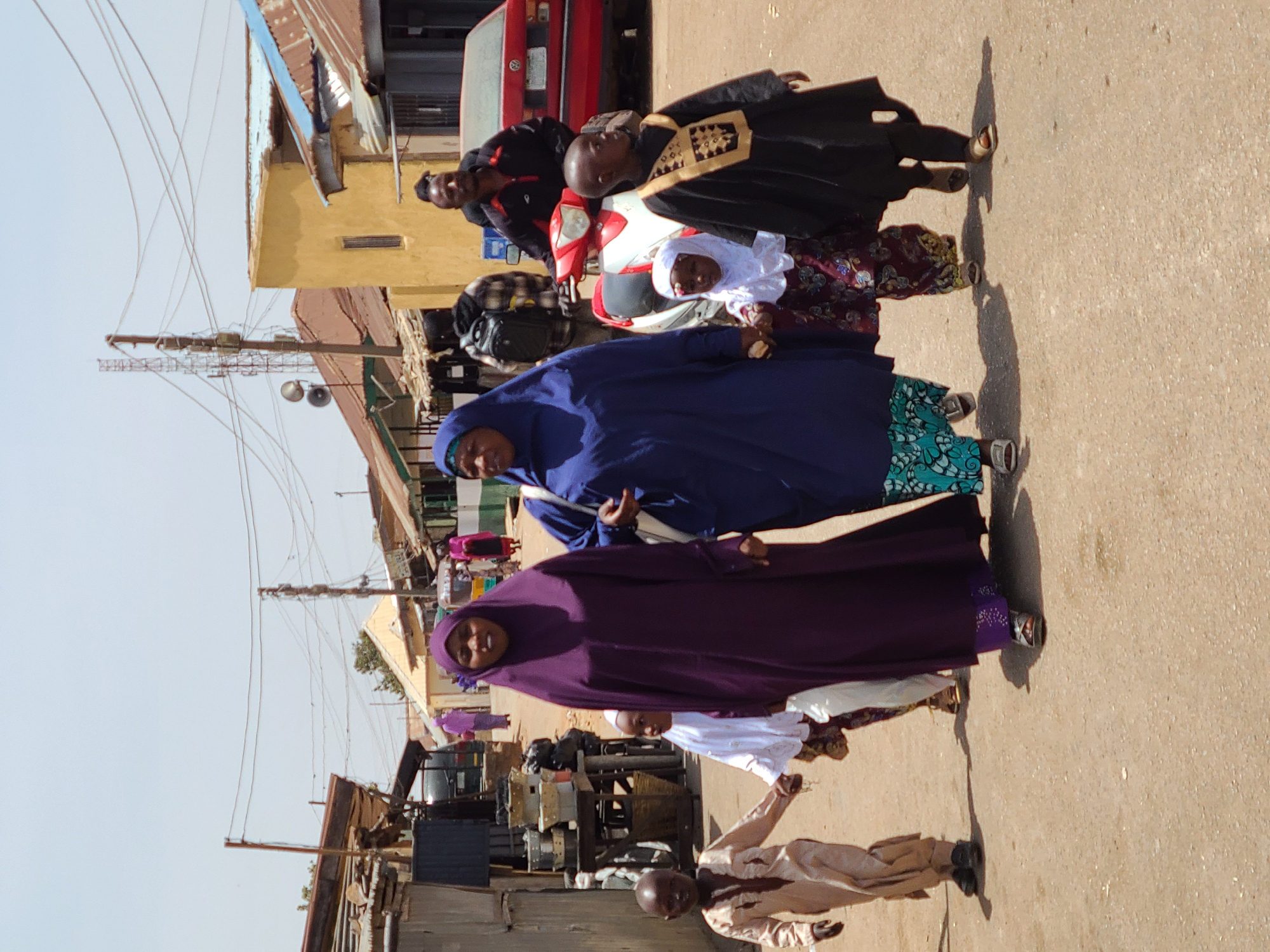 The image displays a sunlit street scene in Jos, Nigeria. In the immediate foreground, six individuals walk from left to right on a light brown, unpaved road. This group consists of two adult females and four children. On the far left, a young boy in a light brown traditional garment holds hands with a younger girl wearing a white headscarf and a patterned dress. This girl also holds hands with an adult female in a long purple hijab and robe, who is centered in the group, looking towards the viewer with her mouth slightly open. To her right, another adult female in a blue hijab and a patterned skirt walks, holding hands with a small child in a white headscarf and a patterned dress. On the far right, a young boy in a black traditional garment with gold and black embroidery on the chest walks, looking to his right. In the mid-ground, a man with dark hair tied back rides a red and white motorcycle, facing forward. Behind him, a red sedan is parked. Another adult male, wearing a plaid shirt and a black backpack, is partially visible walking away from the camera behind the motorcycle. The street is bordered by single-story buildings with weathered walls and corrugated metal roofs. A yellow building is prominent on the right. On the left, a vendor stall or shop displays various items on a wooden table. Multiple wooden utility poles support numerous crisscrossing overhead power lines. In the background, a tall metal communication tower is visible, along with two horn-shaped speakers mounted on a building or pole. The sky is clear and light blue, indicating bright daylight. Further down the street, additional indistinct figures are walking, including one in a pink hijab.