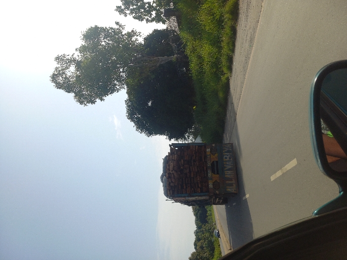 The image depicts a daytime roadside scene in Gudi, Nigeria. The foreground shows the interior portion of a vehicle, including a green/teal door frame and a side-view mirror reflecting a person's arm or leg. The road ahead is asphalt, featuring two visible lanes and a broken white center line. A weathered green and blue flatbed truck, carrying a tall load of stacked logs or firewood, travels in the mid-ground. The rear of the truck displays "ALLAH VARIVA" in white letters. In the far distance on the opposing lane, a smaller vehicle is visible. To the right of the road, a dirt shoulder leads to a grassy embankment with dense green foliage and several large, mature trees. The sky above is clear and light blue.