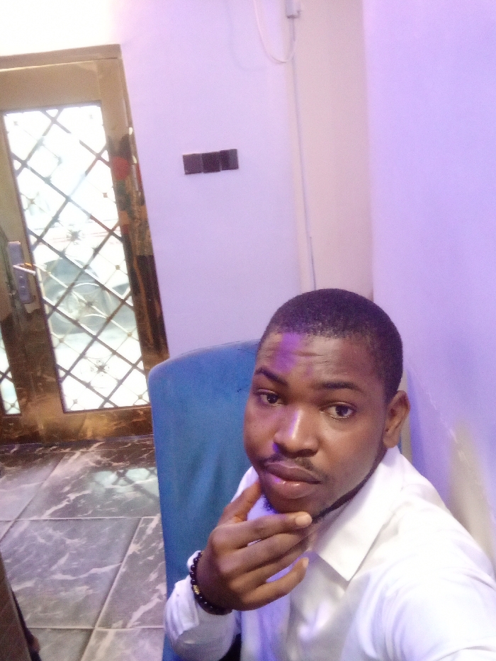 An indoor scene in Igrwre-Ovie, Nigeria, features an adult male subject seated in a blue upholstered chair