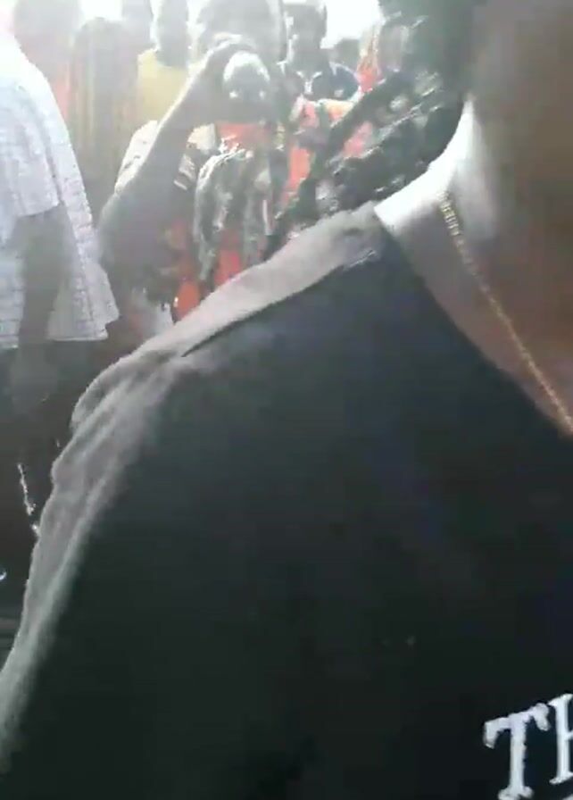 gathering of people outdoors, possibly a social event. The environment appears to be somewhat rural, with sparse vegetation. The camera focuses on various individuals, including a person in an orange shirt with a camera around their neck, who is holding a bottle and taking a drink. Another person is wearing a black shirt with a graphic print and a gold chain. There is movement and activity among the crowd, suggesting a lively atmosphere.