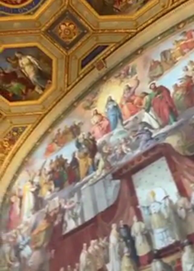 portion of a wall and the ceiling of what appears to be a building with ornate art. The wall contains a large painting featuring a crowd of people, some in religious vestments, others in simpler attire. Above the crowd are figures that seem to be from religious imagery, including Jesus. The ceiling is decorated with octagonal panels, each with a painting inside, surrounded by a gold frame. There are additional decorative elements around the panels. The video moves, shifting the focus from the mural on the wall to the ceiling.