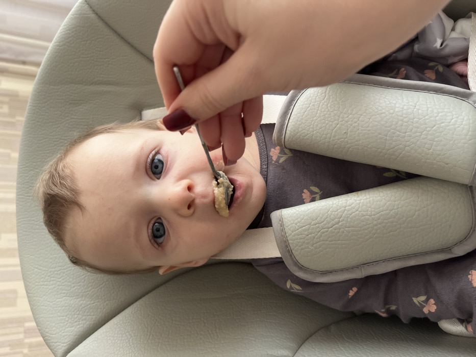 The scene is an indoor feeding event in Mytishchi, Russia. A baby with light hair and blue eyes is seated in a light grey high chair or booster seat with padded shoulder straps, wearing a dark grey long-sleeved shirt patterned with pink flowers. An adult hand, displaying a dark red manicure, holds a small metal spoon containing light-colored, pureed food towards the baby's open mouth. The background features a light-colored, vertically textured wallpaper and a partial view of a light curtain.