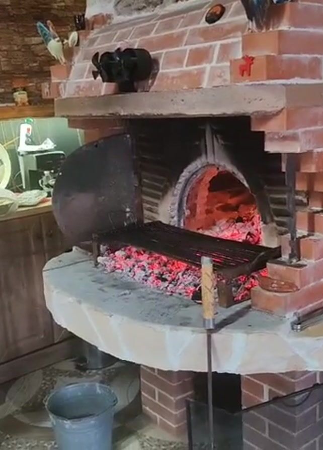 man in a kitchen tending to a brick oven. The man, wearing a black shirt and blue pants, is standing to the left of the oven, holding a tool with a gloved hand. The oven is made of red bricks and has a stone base. Inside the oven, there are glowing coals and a metal grill. To the left of the man is a counter with various items, including a plate covered with plastic wrap. To the right of the oven is a counter with a coffee maker and other items. There is also a bucket on the floor near the oven. The kitchen has a rustic feel with brick walls and wooden cabinets.