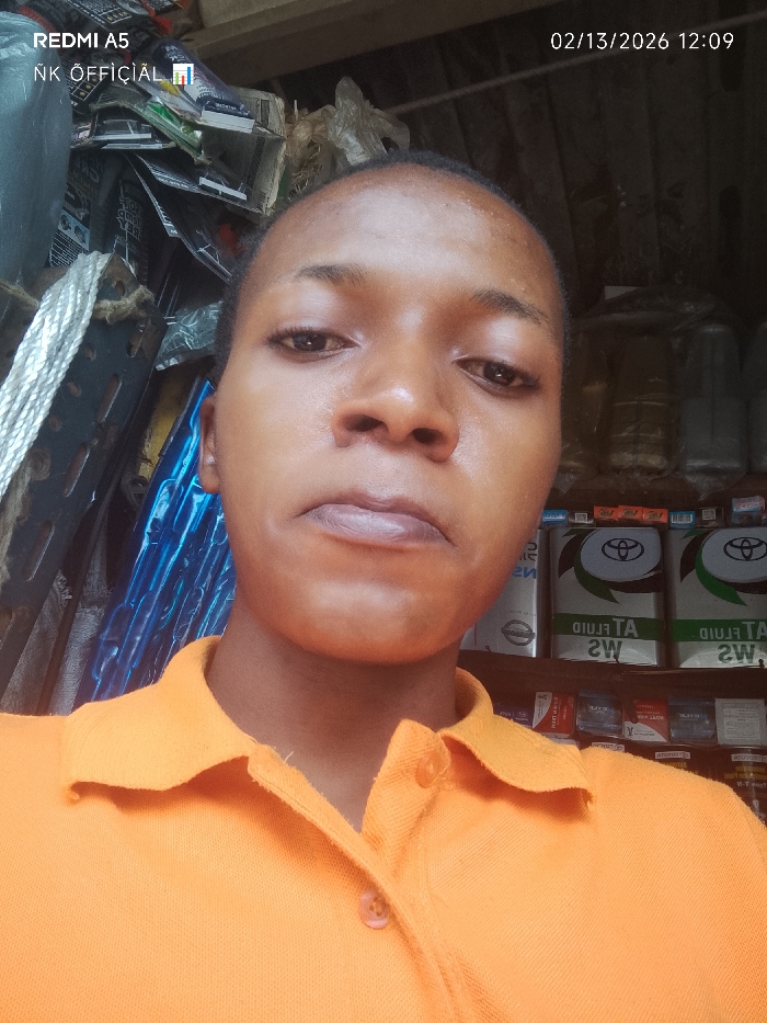 A young individual, likely female, with short dark hair and dark skin, is depicted in a head-and-shoulders portrait, facing the camera directly with a neutral expression. They are wearing an orange polo shirt with two visible buttons. The scene is set indoors within what appears to be a crowded retail shop, consistent with a commercial establishment in Onitsha, Nigeria. The background is densely packed with merchandise. On the right, multiple white containers labeled "TOYOTA AT FLUID WS" are visible on shelves, with smaller packaged items below. On the left, a coiled metallic cable or rope, bundled blue reflective material, and other assorted goods are stacked. The image is timestamped "02/13/2026 12:09" and includes "REDMI A5 NK OFFICIAL 🇳🇬" metadata.