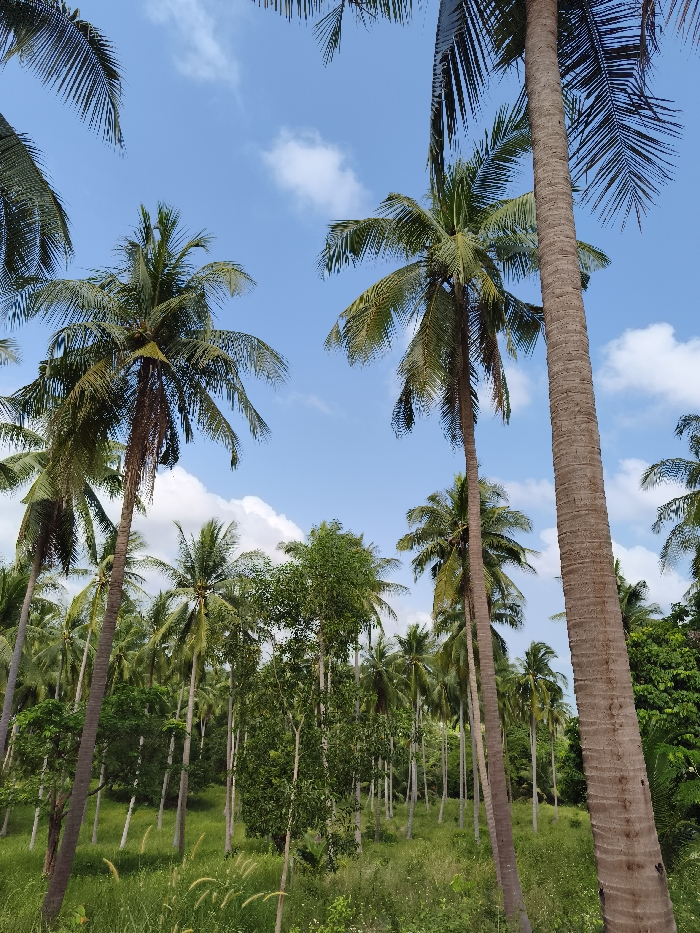A vibrant scene shows numerous tall palm trees reaching towards a bright blue sky dotted with puffy white clouds. The trunks, some close and textured, others fading into the distance, stand amidst lush green vegetation. The ground is covered in tall grasses and other leafy plants, adding depth to the tropical landscape. The scene is bathed in sunlight, enhancing the colors and creating a sense of warmth.