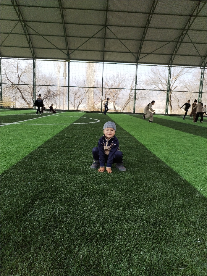 - "A young child in a blue tracksuit and hat sits cross-legged on a vibrant green artificial turf field" by FM-F7Esh2, licensed under CC BY 4.0