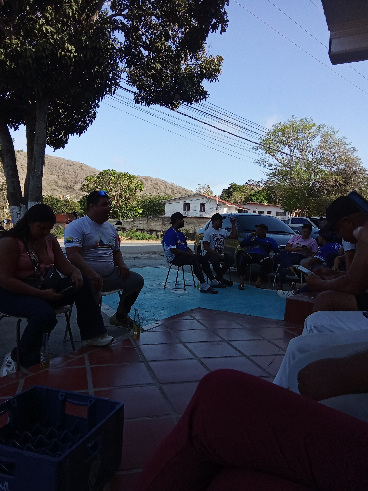 A group of people are seated on chairs outdoors on a patio in La Asuncion, Venezuela