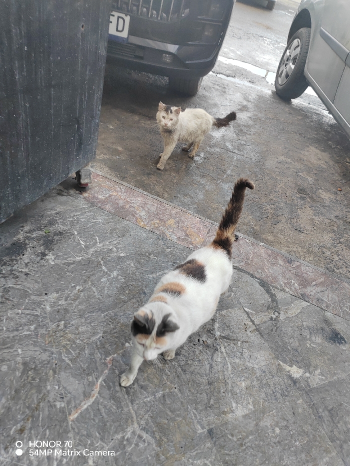 Two cats stand on a marbled surface near vehicles. One cat, closer to the viewer, is white with brown and black patches and a distinctive striped tail. The other cat, further away, is mostly white but appears dirty or weathered. Part of a black vehicle is visible on the left, with a silver car on the right. The scene appears to be outdoors, possibly in a parking area or near a curb. A water mark appears in the lower left corner of the image.