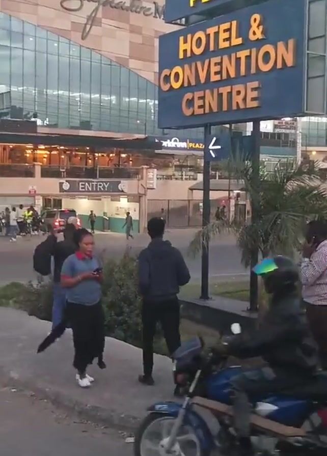 street scene in front of the Prideinn Plaza Hotel & Convention Centre. Several people are walking on the sidewalk, some using their phones. A man is talking on his phone. A motorcycle is parked nearby. In the background, there's a large building with "Signature Mall" written on it, and cars and people are entering a parking area. The sky is overcast, suggesting it's either dusk or dawn.