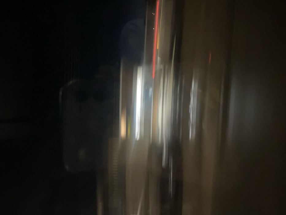 The image depicts a nighttime urban or semi-urban scene in the city of Кварса, Russia, characterized by significant motion blur, suggesting capture from a moving vehicle. The primary light sources are artificial. In the mid-ground, horizontal streaks of bright white light extend across the frame, originating from an indistinct structure or fixed lighting. To the right, shorter, horizontal streaks of red light are visible, consistent with vehicle taillights. The lower portion of the image shows a dark, reflective surface, indicating a wet or asphalt road. In the upper part of the frame, faint, dark reflections of a person's head and shoulders are subtly visible, superimposed over the dark background, suggesting the image was captured through a reflective barrier like a vehicle window. No specific individuals or identifiable objects are clearly discernible due to the extreme blurring.