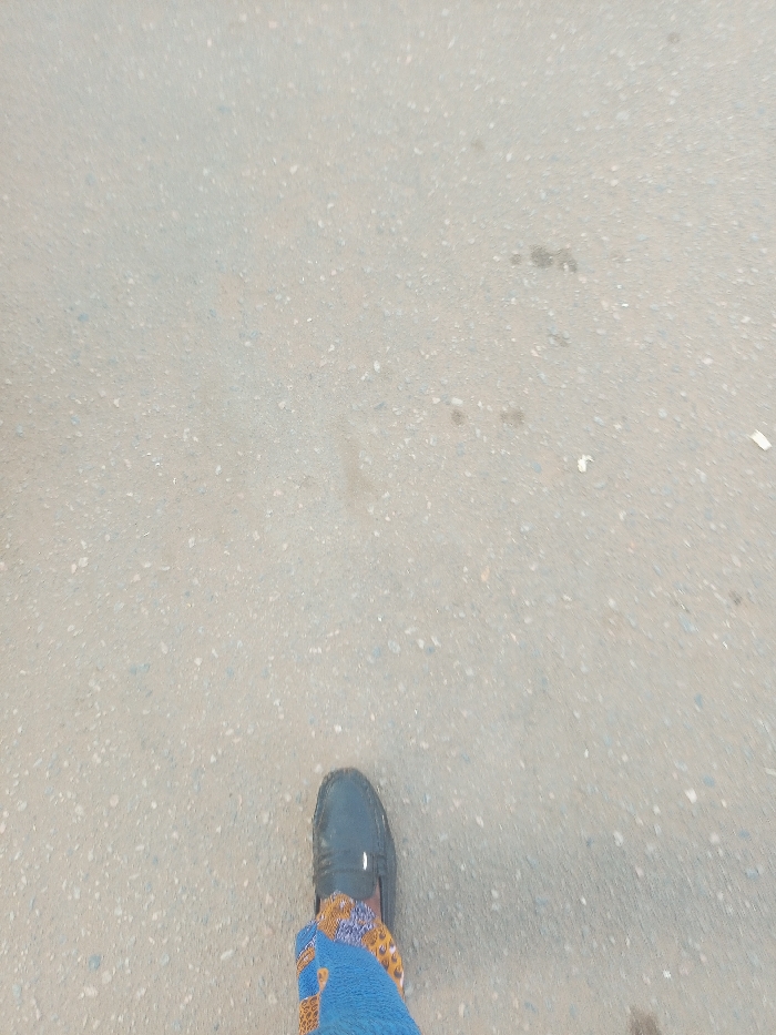A close-up shot shows a person's leg and foot on a grey, textured surface. The leg is partially visible, clad in blue and patterned material. A black loafer-style shoe is on the foot. The background is the concrete surface, speckled with lighter and darker tones. The angle suggests a first-person perspective while walking.