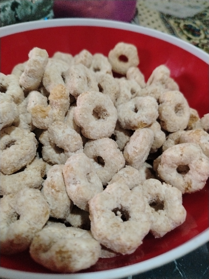 The scene is located in Navoiy City, Uzbekistan. A red bowl, filled to capacity, contains a multitude of ring-shaped food items. Each item measures approximately 2-3 cm in diameter, exhibiting a light beige to golden-brown base color, and is uniformly coated with a fine, white, powdery substance. The items display an irregular, textured surface consistent with a fried or baked dough product. The bowl features a prominent white rim. The immediate foreground presents the edge of a dark surface with subtle patterning. The blurred background reveals a light-colored textile, likely a rug, adorned with darker geometric or floral patterns, situated behind the bowl. Indistinct, blurry objects, including a green element to the upper left and a purple element to the upper right, are also visible.
