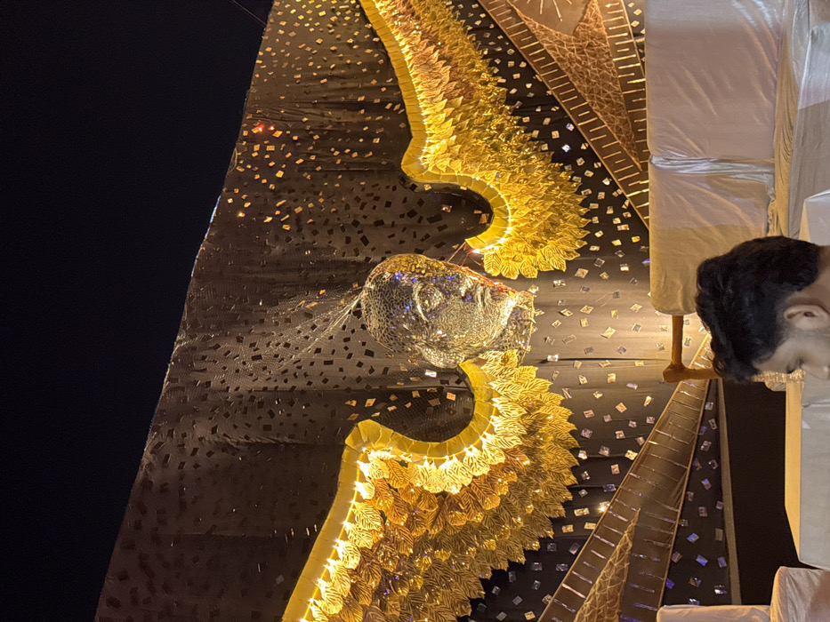 The image displays an artificially lit nighttime scene at an event or stage setup in Bidhannagar, India. The central focal point is a large, elaborate backdrop featuring a reflective silver human-like head sculpture positioned centrally. This head is tessellated with small mirror-like facets, and a bright light streak emanates from its top. Symmetrically extending from behind the head are two large, illuminated golden wings, each constructed from numerous leaf-shaped, reflective golden elements. The background wall behind the sculpture and wings is dark, sparsely adorned with small, scattered square reflective pieces. In the lower foreground, the upper back and right profile of a male individual with dark hair and a short beard are visible, facing left. A partially visible plastic water bottle and light-colored, fabric-draped furniture, possibly seating, are present in the immediate foreground.