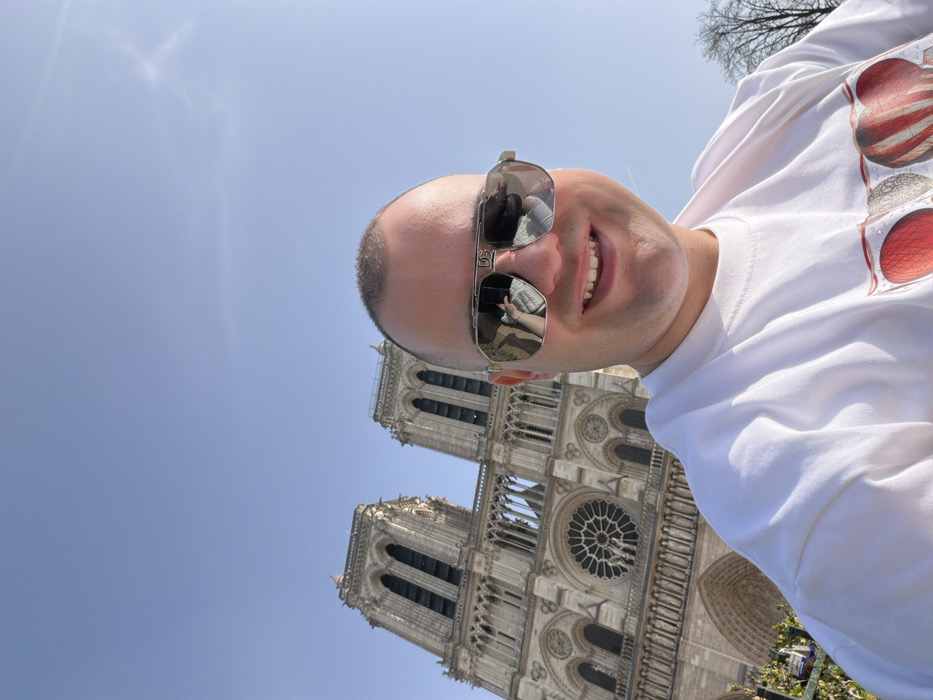 An adult male is prominently featured in a close-up selfie-style photograph, smiling directly at the camera. He has very short hair or is bald, and wears silver-framed aviator-style sunglasses with "D&G" visible on the bridge. He is dressed in a white t-shirt featuring a graphic design on the lower chest, depicting what appears to be anatomical hearts or similar organ illustrations in red and white tones. Behind the individual, slightly off-center to the left, stands the gothic facade of Notre-Dame Cathedral in Paris, France, clearly identifiable by its two prominent rectangular towers, arched entrances, and central rose window. The cathedral's intricate stonework and architectural details are visible under a clear, bright blue sky that dominates the upper portion of the frame. Bare tree branches are partially visible on the far right, and some sparse greenery is present in the bottom left corner, suggesting an outdoor setting near the cathedral. The scene is illuminated by strong daylight.