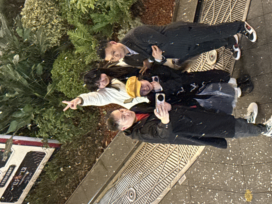 The image, captured from an elevated perspective in an urban area of Liangjiang, China, displays four individuals on a dark paved surface amidst a shower of small, white, reflective specks, indicative of artificial snow or confetti. Behind them is a raised planter dense with green foliage and a partially visible sign displaying '12.5 - 1.31'. From left to right: A male in a black coat and red undergarment holds a silver-colored smartphone horizontally, pointing it forward. Adjacent to him, a female wearing a yellow beanie and dark coat smiles broadly while holding a small white digital camera in a similar forward orientation. Behind these two, a female with long dark hair, dressed in a white jacket, extends her right arm upwards, forming a 'peace' sign. To the far right, a male in a dark suit, white shirt, and glasses stands with his arms crossed. All individuals appear to be posing for a photograph or video.