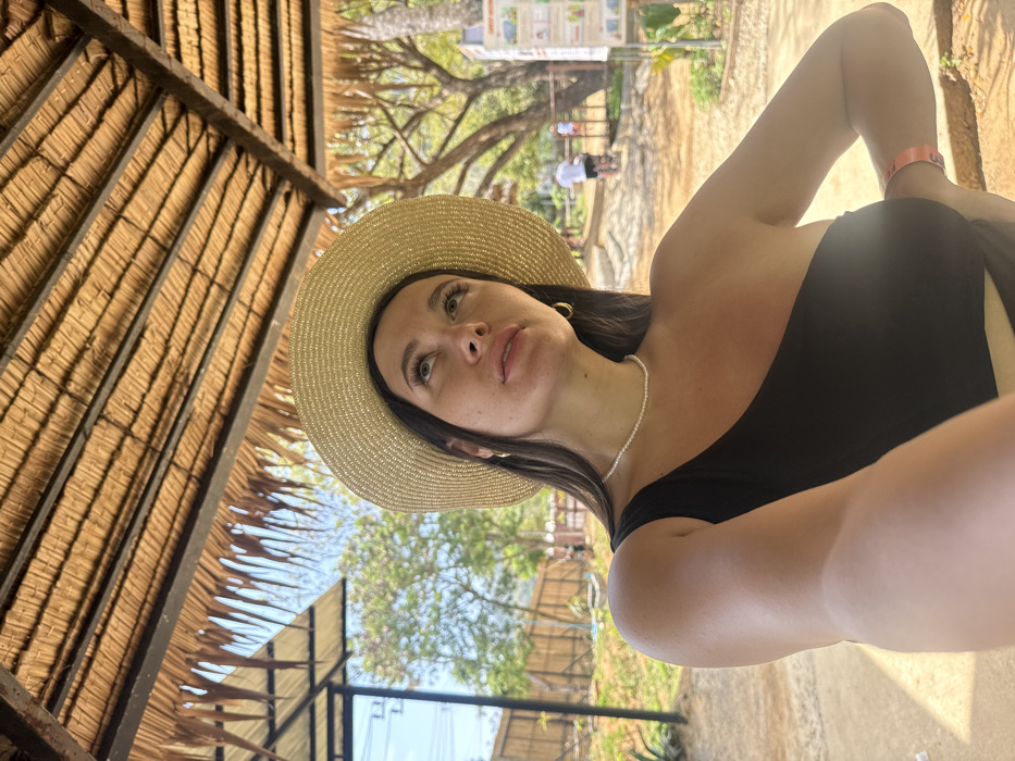A woman in a black one-shoulder top and straw hat takes a selfie. She wears a delicate pearl necklace and gold hoop earrings. The background shows a blurry tropical outdoor scene with trees and people. A thatched roof structure is visible on the left. The photo is taken from a low angle, slightly tilted. The woman is fair-skinned with dark hair and light eyes.