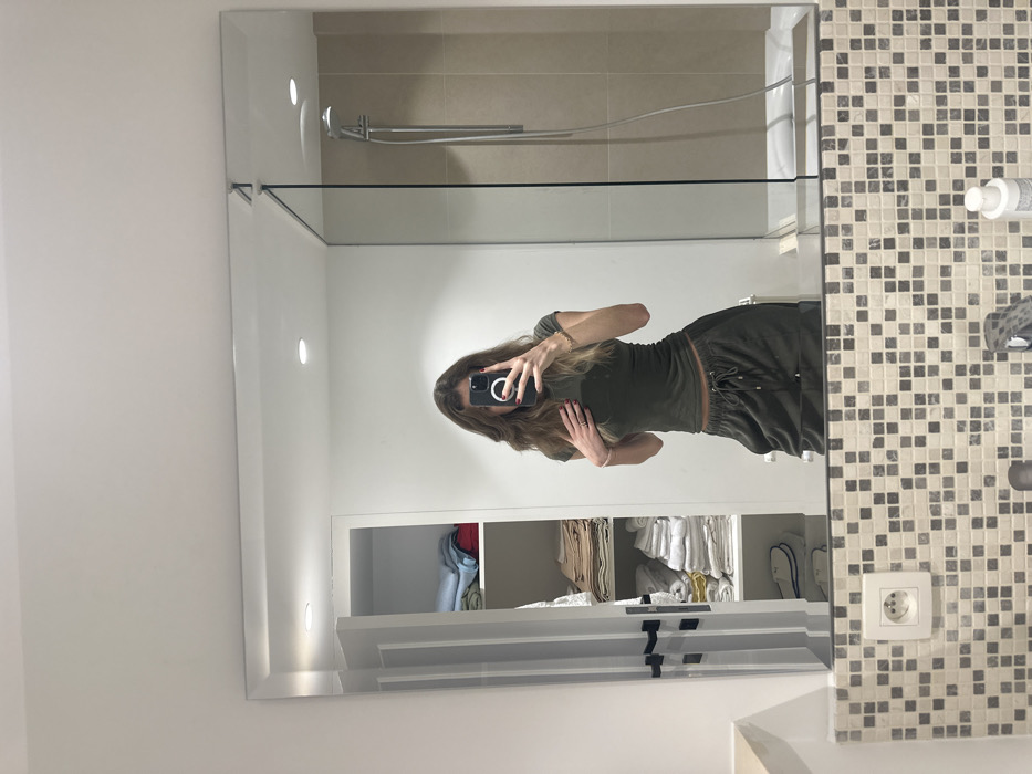 The scene depicts a modern residential bathroom in Brussels, Belgium. The image is a mirror selfie showing a female individual with long, wavy, light brown hair. She is wearing a dark olive green short-sleeved top and matching or similarly colored drawstring sweatpants. Her left hand holds a black smartphone, featuring a visible circular attachment on its back, positioned to capture the reflection. Her right hand rests on her upper chest. A ring is visible on her left ring finger and a bracelet on her right wrist. Her fingernails are painted red. The large, rectangular mirror reflects the bathroom interior. To the reflected left, an open, white shelving unit contains neatly folded towels and linens of various colors, including white, beige, light blue, and red, with white slippers visible on a lower shelf. A partially open white door with dark handles is visible next to the shelving unit. To the reflected right, a walk-in shower stall is separated by a clear glass partition. The shower interior features light beige wall tiles and is equipped with a silver showerhead and a handheld shower hose. A white shower base or tub rim is visible at the bottom of the stall. The area below the mirror features a light-colored vanity counter with a mosaic tiled backsplash composed of small, variegated square tiles in shades of grey and beige. A white European-style electrical outlet is mounted on this backsplash to the left. A metallic faucet and a white cylindrical bottle are visible on the vanity surface to the right. The bathroom has white walls and is illuminated by two circular recessed ceiling lights.