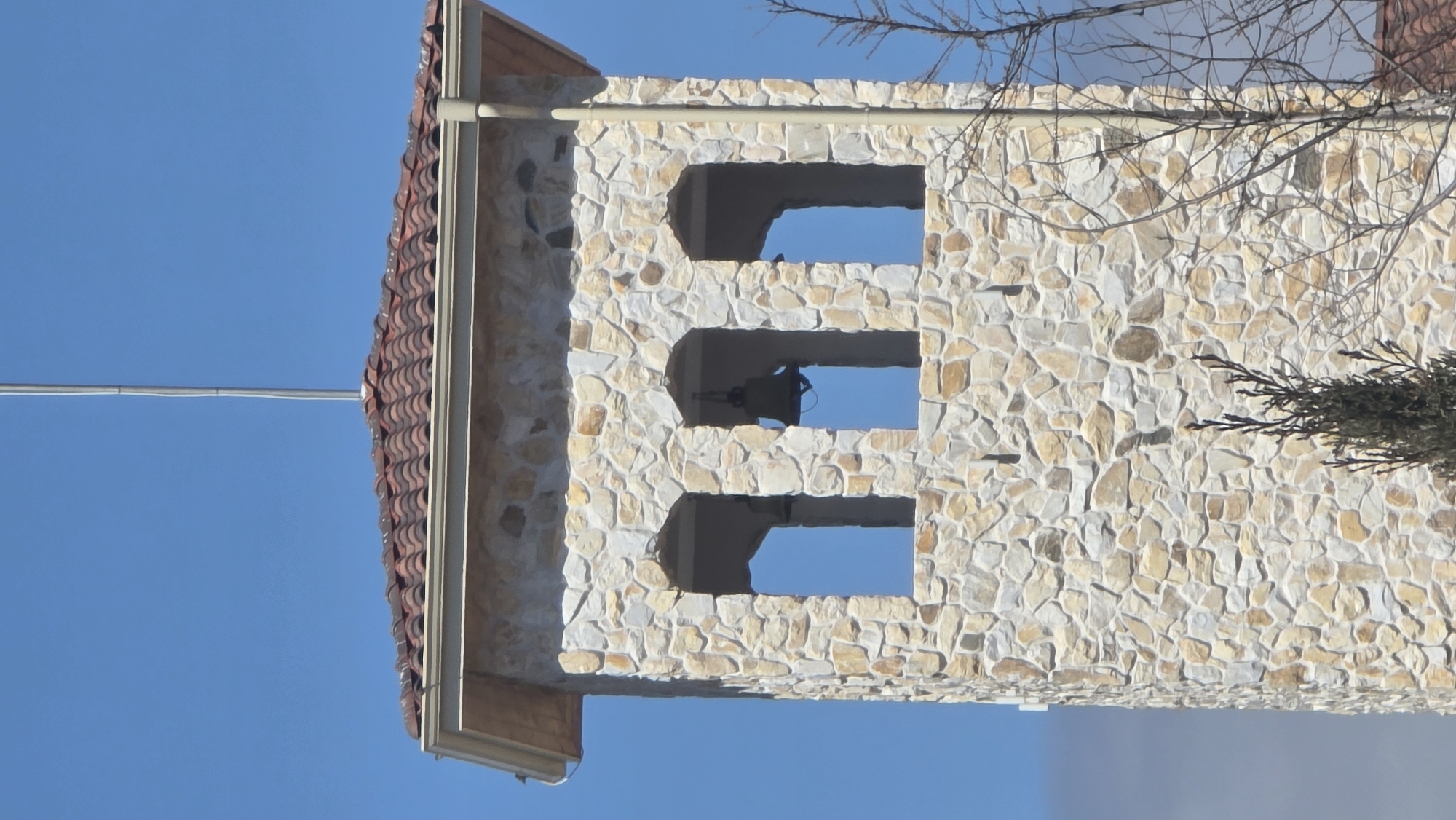 A medium shot depicts the side of a stone bell tower in Kocherinovo, Bulgaria, against a bright blue sky. The tower is constructed of irregular, light-colored stones. It features three window-like openings, with a dark shape of a bell hanging in the center opening. The tower has a tiled roof in warm brown and reddish tones. A few thin, bare branches are visible on the right side of the tower. A white horizontal wire cuts through the clear sky.