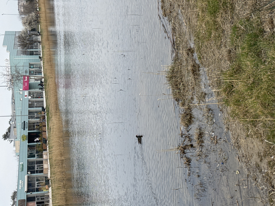 The image depicts a section of the Anapka River embankment in Anapa, Russia, viewed from a natural bank. In the immediate foreground, a muddy and sparsely vegetated bank shows a mix of dry, brown grass and sporadic patches of green growth, with minor debris visible at the waterline. The midground is dominated by the calm surface of the Anapka River, from which numerous thin, dry reeds protrude vertically at varying intervals. A single dark-feathered duck, exhibiting a dark head and body with a lighter flank, swims horizontally from left to right in the water, generating a discernible wake. Across the river, in the background, a paved promenade separates the water from a row of modern, two-story commercial buildings. These structures feature light blue/teal facades, large glass windows, and prominent signage. Visible establishments include "PORTO MARE" (a restaurant/cafe), "ТРАТТОРИЯ" (Trattoria), "FLORENCE" (a store), and "juice you" (a juice bar). Outdoor seating areas with tables and chairs are positioned in front of some businesses. Three individuals are identifiable: one person is standing near "ТРАТТОРИЯ," and two other individuals are seated on a bench directly in front of "juice you." No specific interactions are clearly observed. Leafless deciduous trees and one tree with white blossoms are visible behind the buildings, under an overcast sky.