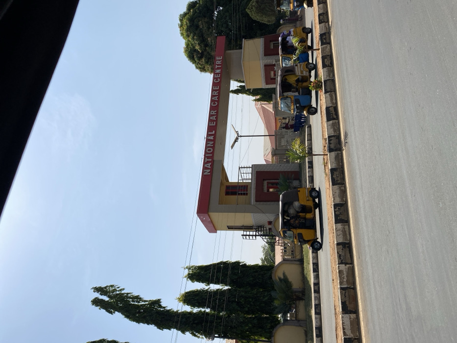 The image displays the main entrance of the National Ear Care Centre in Kaduna, Nigeria, under a clear daytime sky