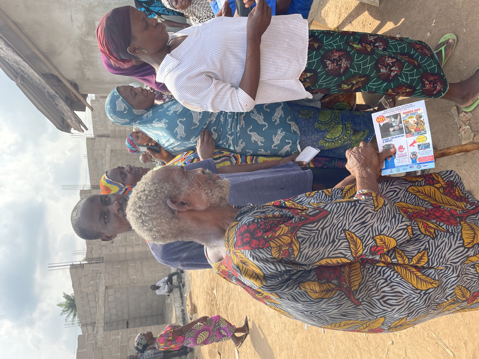 An outdoor scene in Osara Gada, Nigeria, depicts a gathering of approximately ten individuals, predominantly adults, under a hazy sky