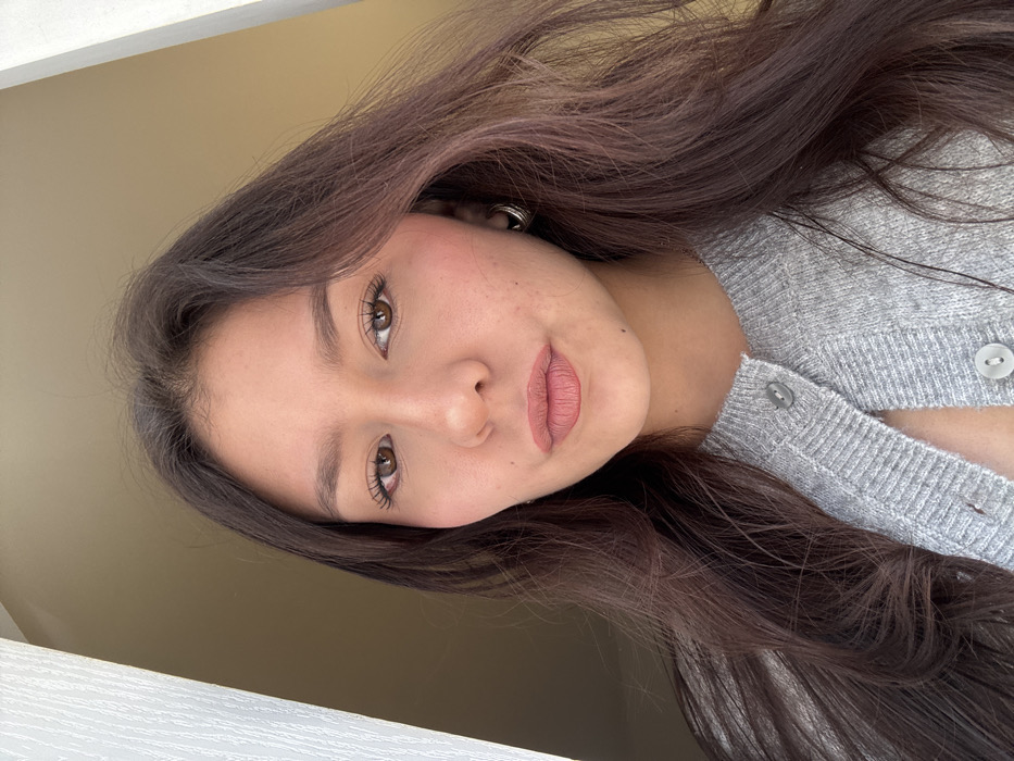This image presents a close-up portrait of a female subject, located in what is specified as San Francisco Ocotlán (Ocotlán), Mexico. The subject possesses long, dark brown hair, parted slightly off-center, cascading over her shoulders. Her brown eyes maintain a direct gaze towards the viewer, with her facial expression appearing neutral. She wears light cosmetic enhancements, including mascara on her eyelashes, a faint pink blush on her cheeks, and matte nude-pink lipstick. A silver-colored hoop earring is visible on her right ear. Her attire consists of a light gray, ribbed knit cardigan, partially unbuttoned, with three light gray buttons visible down the front. The background is out of focus, featuring a blurred light brown or tan interior space, framed on the left and right by vertical white or light-colored architectural elements, likely door or window frames. Natural light illuminates the subject from the front.