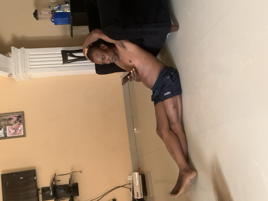 An adult male is observed indoors, seated on a light-colored tiled floor, leaning against a dark-colored sofa or armchair in a residential living space in Ijegun, Nigeria