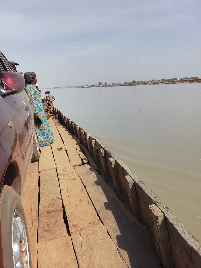 The image depicts a flat-bottomed wooden ferry transporting a vehicle and passengers across a wide, murky river in Ibi, Nigeria