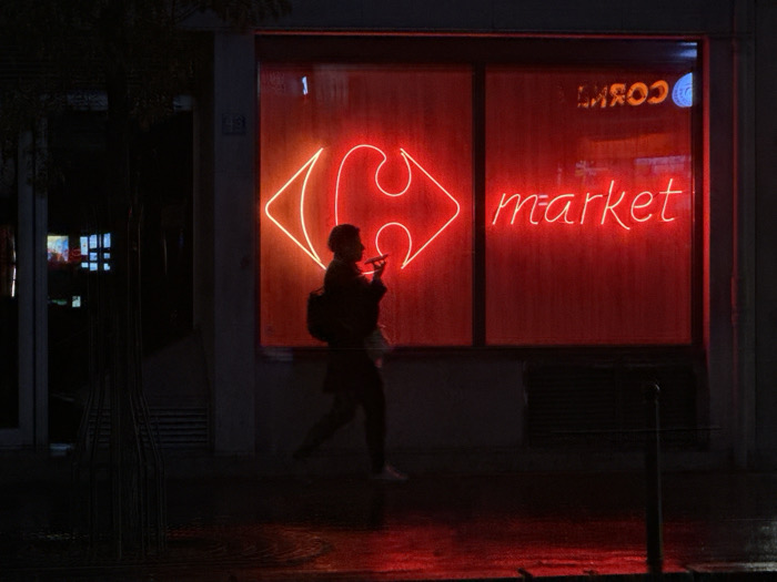 - "A single person, silhouetted against a vibrant red and orange neon sign, walks from left to right past a "Carrefour market" supermarket in Paris, France, during nighttime" by FM-lS6eB2, licensed under CC BY 4.0