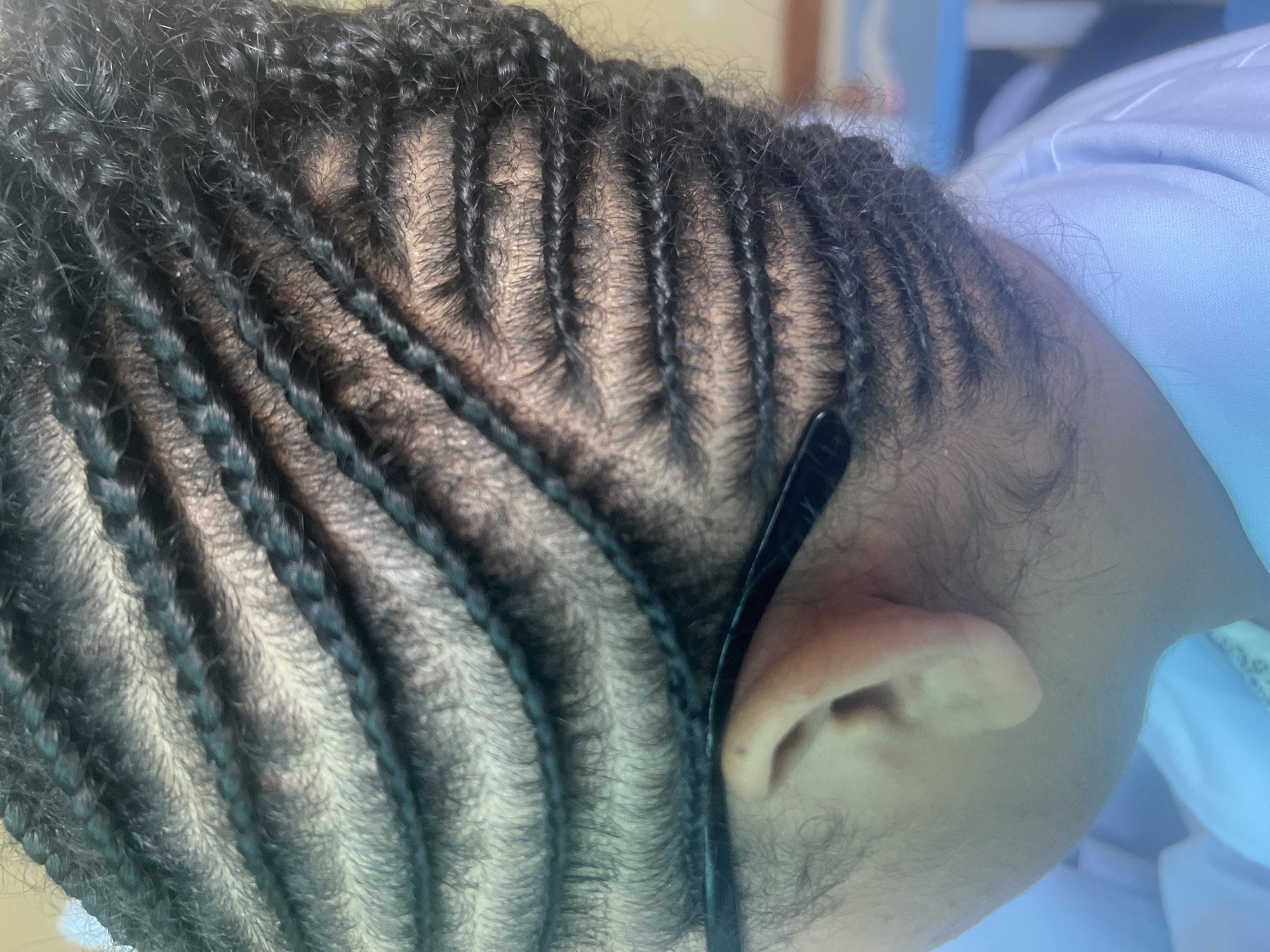 The image presents a close-up, oblique view of the right side of an individual's head. The primary subject is the person's dark, natural hair, styled into numerous tight cornrows. These braids are arranged in parallel rows, extending from the crown region downwards and backwards, exposing visible sections of light-toned scalp between each row. The right ear is partially visible, with a black spectacle arm resting across its upper portion, indicating the individual is wearing glasses. Loose, curly hair is discernible around the ear and at the nape of the neck. The individual wears a light-colored, collared garment, possibly white or light blue, visible on the shoulder and neck area, consistent with a uniform. The background is significantly out of focus, revealing indistinct hues of yellow and blue, suggesting an indoor environment. The specific location within Dar es-Salaam, Tanzania, cannot be ascertained from the visual evidence presented.