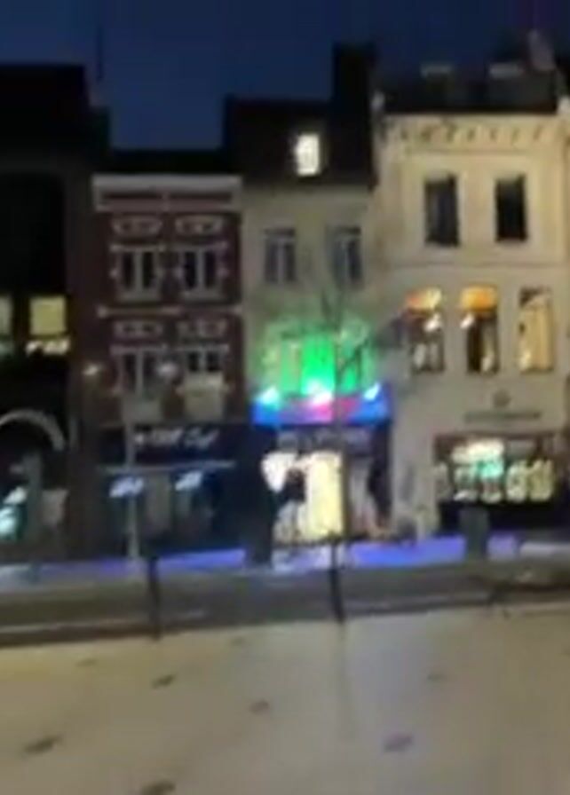 street in a European city at dusk. The pavement is wet and reflects the streetlights. The camera pans up to show a row of buildings, mostly two and three stories, with shops and cafes on the ground floor. A few cars pass by. The buildings are a mix of architectural styles, some with arched windows and others with more modern designs. The sky is dark blue.
