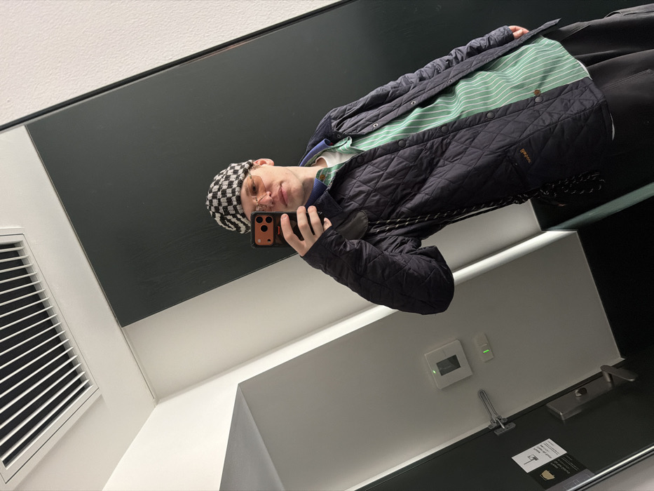 A person wearing a black and white checkered beret, eyeglasses, and a dark quilted jacket over a green and white striped shirt takes a selfie in a mirror