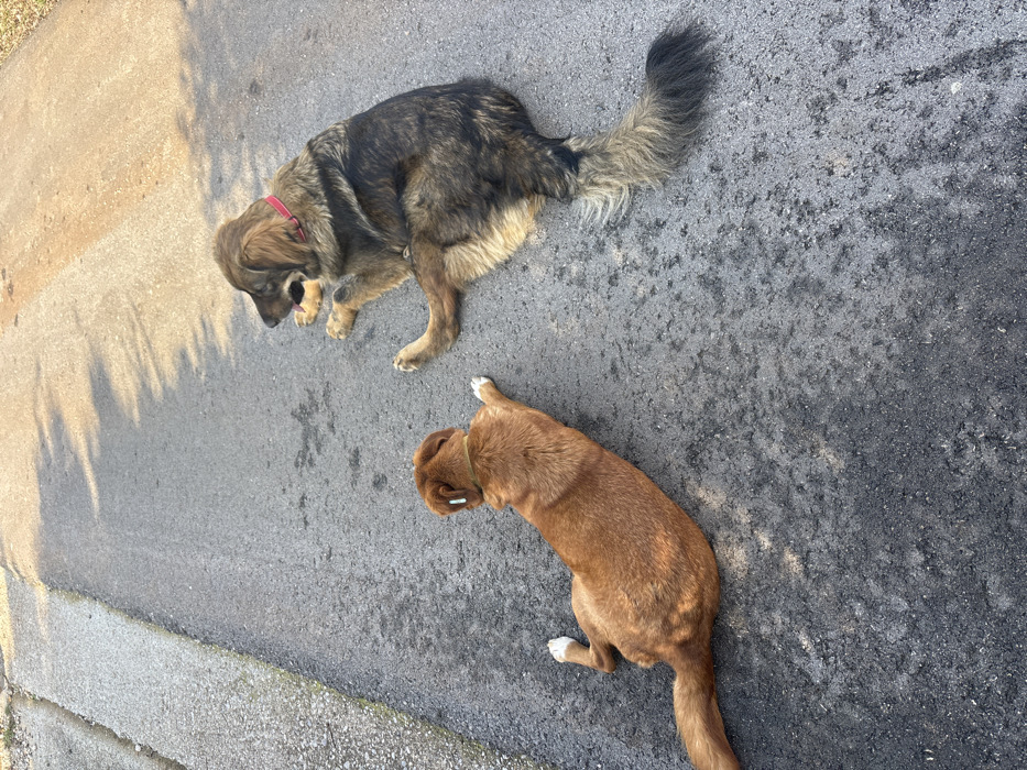 Two dogs are resting on an asphalt road in Kunje, Montenegro. The scene is illuminated by directional sunlight, casting elongated shadows. On the right, a large dog with mottled brown, black, and tan fur and a red collar is lying on its left side, facing towards the upper left. Its tail is long and bushy, dark at the tip. To the left and slightly below, a smaller reddish-brown dog is lying on its stomach, stretched out, also facing generally towards the upper left. A light-colored, possibly white or light blue, rectangular object is visible on the smaller dog's collar or neck, protruding upwards. The asphalt surface is dark gray, with a lighter concrete curb visible along the left edge of the frame. No other subjects or objects are present.