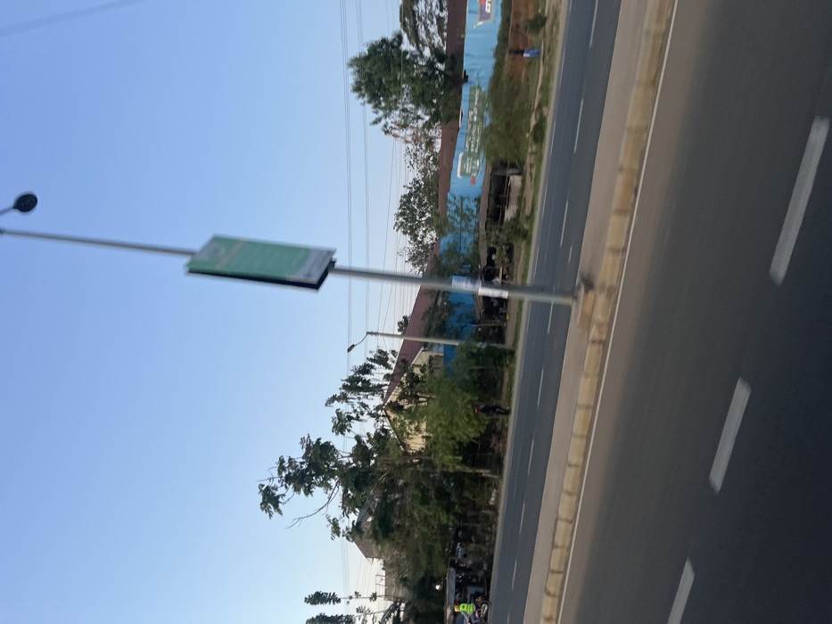 The image captures a daytime roadside scene in Biashara ward, Kenya, under a clear, light blue sky. The foreground features a multi-lane asphalt road with white dashed lane markings, bordered by a light brown concrete median. A tall, slender metal pole, likely a street light post, with a rectangular green sign attached, stands on this median. On the left side of the dirt shoulder adjacent to the road, a person wearing a high-visibility yellow-green vest is seated on a green motorcycle, facing left. Further to the right, another individual in dark clothing, possibly wearing a red cap, stands on the dirt shoulder, facing right. Distantly, on the right side of the road, a third person in dark attire is visible standing on the shoulder, facing left. The mid-background reveals dense green vegetation, including trees and bushes. Behind this, a building with a reddish-brown tiled roof is partially visible. A long, light blue barrier or fence runs parallel to the road, partially obscuring several small, makeshift structures or stalls. Indistinct white text or graphics are visible on the blue barrier. Overhead power lines traverse the upper portion of the scene. The lighting suggests either early morning or late afternoon.