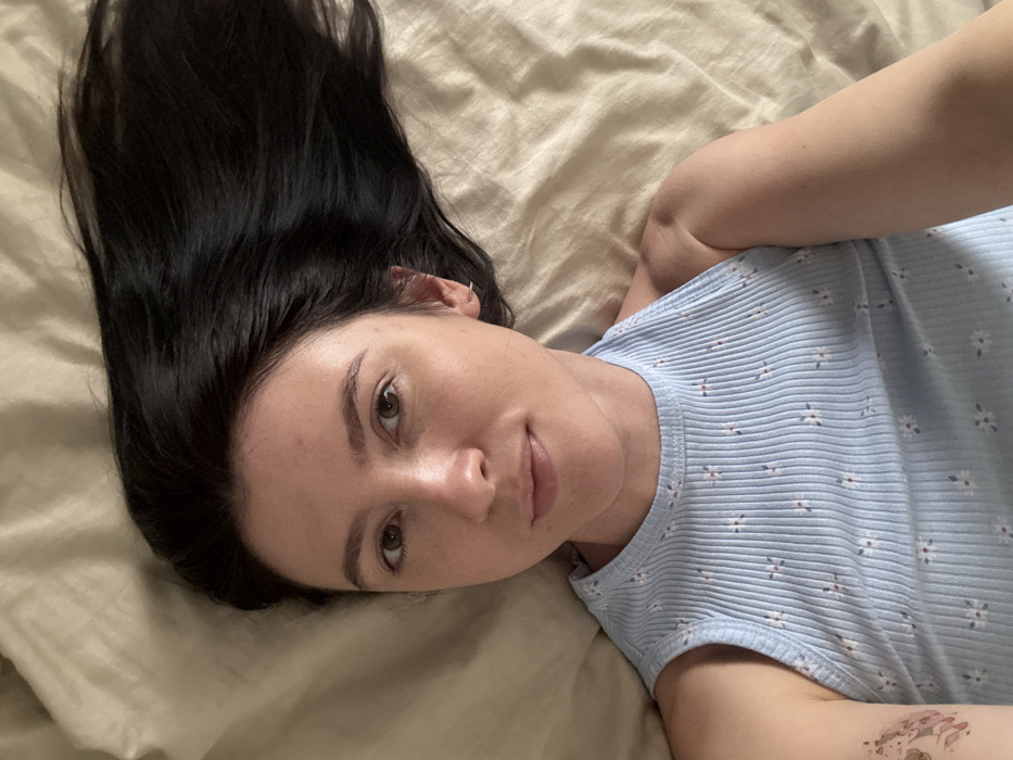 A woman with long, dark hair lying on a beige-colored bed. She is facing the camera with a slight smile. She is wearing a light blue tank top with a small floral pattern. Her left arm is visible with a small, indistinct tattoo. The lighting is soft and natural. Her head is tilted to the side on the bed.