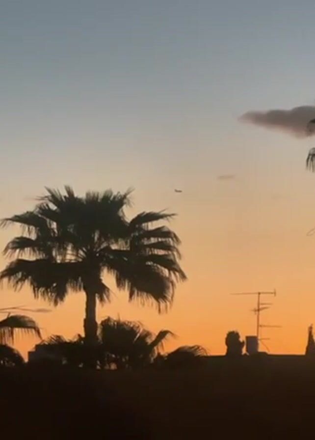 silhouetted cityscape, with palm trees prominently in the foreground against a vibrant sunset backdrop. An airplane is visible in the distance sky. There are also antenna on top of a building. The sky transitions from a light blue to a rich orange as the sun sets.