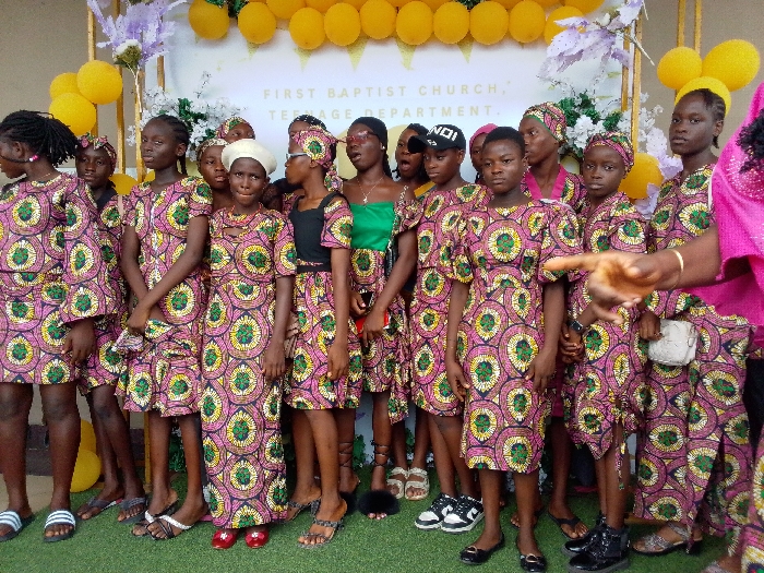 A group of teenage girls stand in front of a wall decorated with gold balloons and a sign that reads "First Baptist Church, Teenage Department". They are all wearing matching pink and green patterned dresses. Some girls are holding small purses. One girl is wearing a black hat with a white inscription. The girls are all smiling and looking at the camera. The scene is likely a gathering of the First Baptist Church's youth group. The coordinates provided locate the scene in Yenagoa, Bayelsa State, Nigeria.