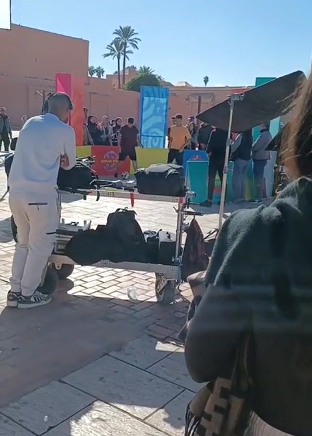 The video captures a scene on what appears to be a film set, set outdoors on a sunny day. The ground is covered with light-colored paving stones. In the foreground, a person wearing a black sweater and a patterned scarf is partially visible, positioned to the right of the frame, possibly holding the camera. To the left of the camera, another person in a white long-sleeved shirt and white pants is leaning on a large, gray equipment cart. The cart is laden with dark-colored bags and what looks like film equipment. In the background, a crowd of people are gathered near a series of colorful banners or structures. The banners are painted in shades of red, blue, and yellow, with what looks like writing or symbols on them. Palm trees are visible in the distance, adding to the outdoor setting. The scene appears to be bustling with activity, suggesting a live film shoot in progress. A black umbrella with some film equipment is located in the right-center of the frame, further supporting the film production environment.