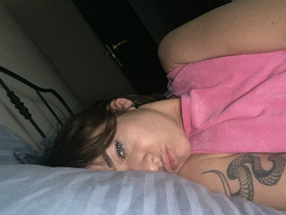 A close-up image depicts an individual with medium-brown hair and visible bangs, lying down, with the left side of their face partially obscured by a light blue striped pillow. The individual has blue eyes, a pouting expression, and wears a pink, possibly terry cloth, sleeveless top. A distinct black snake tattoo is visible on the individual's left upper arm. The background is dim, revealing a dark metal bed frame or headboard at the top, and a dark wall or surface on the right with what appears to be a faint outline of a door or cabinet mechanism, including a handle. The scene occurs indoors in Ust-Ilimsk, Russia.