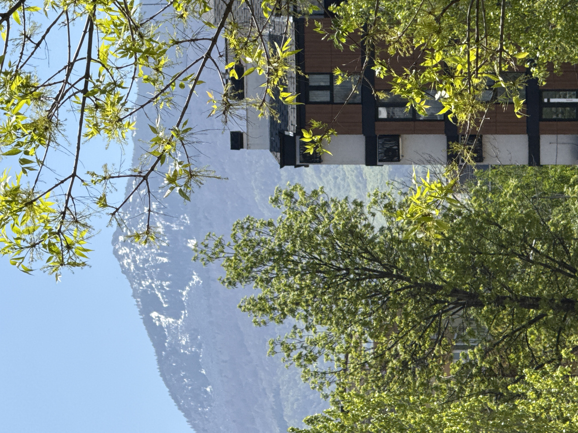 The image presents a view of a building with a mountain backdrop, partially obscured by trees