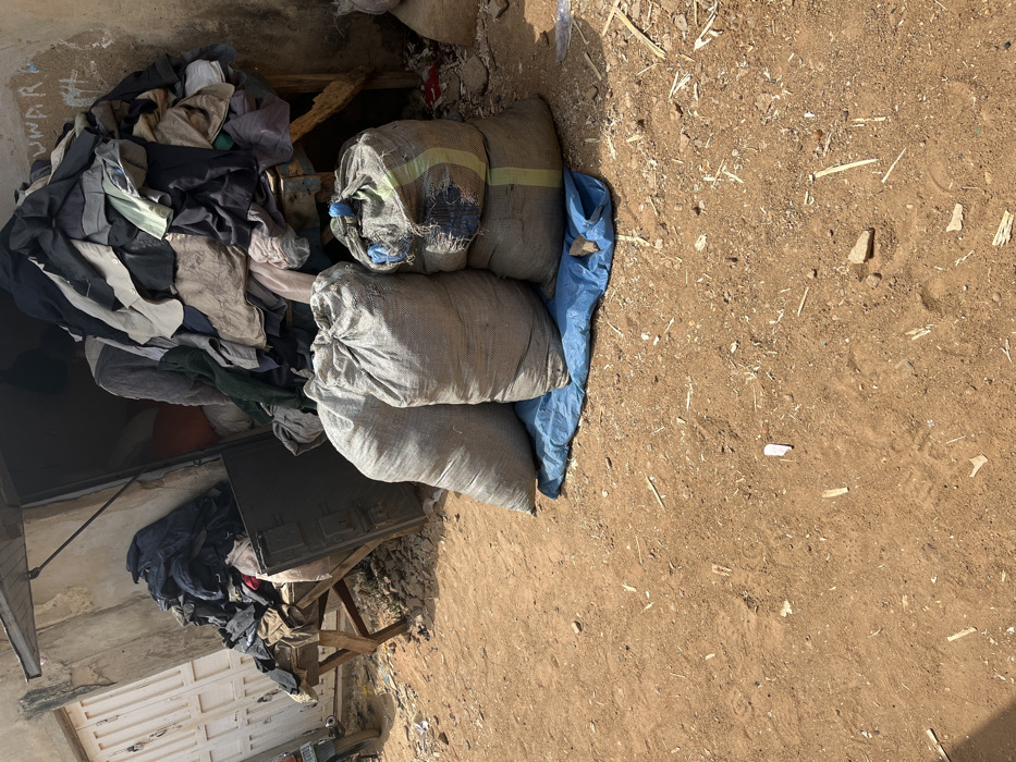The scene depicts an outdoor commercial or storage area in Sabon Gari South, Nigeria. The foreground consists of reddish-brown dirt ground with scattered small debris including wood fragments and white paper pieces. In the midground, five filled sacks are positioned on a crumpled blue tarp. Three larger, light-grey woven sacks stand upright, with two smaller, similarly woven sacks, one featuring a green stripe, stacked behind them. Behind these sacks, a visible alcove entrance of a light-colored, weathered building reveals two large piles of assorted garments on wooden tables or stands. A larger garment pile is situated within the building's alcove, and faint graffiti is visible on the wall above this pile. To the far left, a white wooden door with vertical panels is partially visible, partially obscuring a section of a dark-colored vehicle, consistent with a motorcycle or scooter. No individuals are present in the frame.