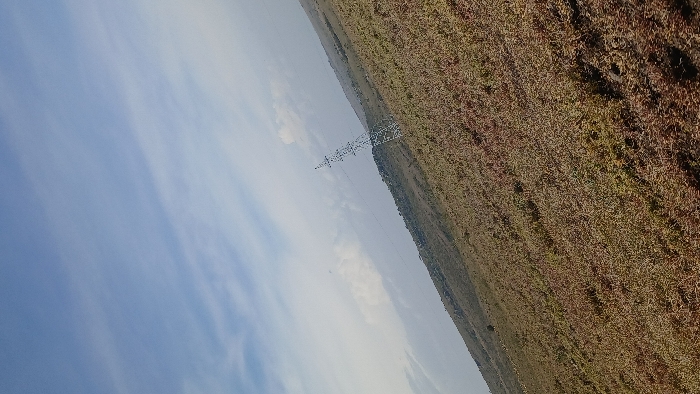 The scene depicts an upward-sloping arid terrain in Kaputiei North ward, Kenya, under a partially clouded blue sky. The foreground and midground are covered in low, dense vegetation, appearing dry and brown with some green interspersed. A single, tall, lattice steel electrical transmission tower stands on the slope, positioned slightly right of center, with visible power lines. In the distance, the terrain continues to rise, meeting a light blue sky with scattered white clouds, some appearing wispy and others more substantial on the horizon. A lone, dark, conical bush or small tree is visible on the upper-left slope. No individuals, animals, or discernible actions are present.